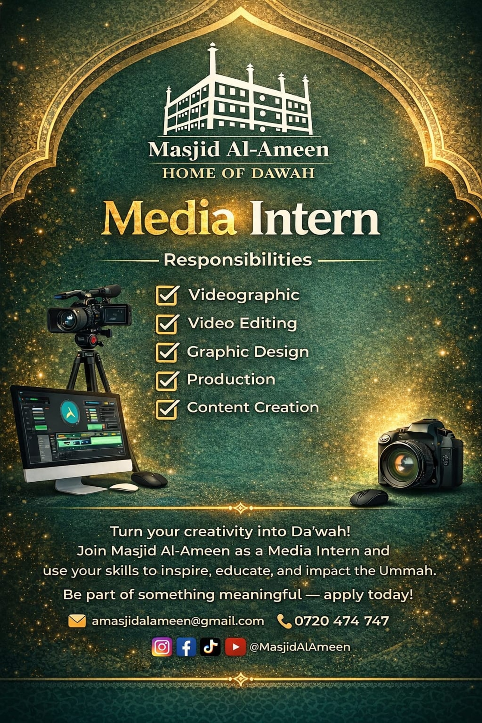 ResponsibilitiesVideographyVideo EditingGraphic DesignProductionContent CreationContact: Email: amasjidalameen@gmail.com Call: 0720 474 747