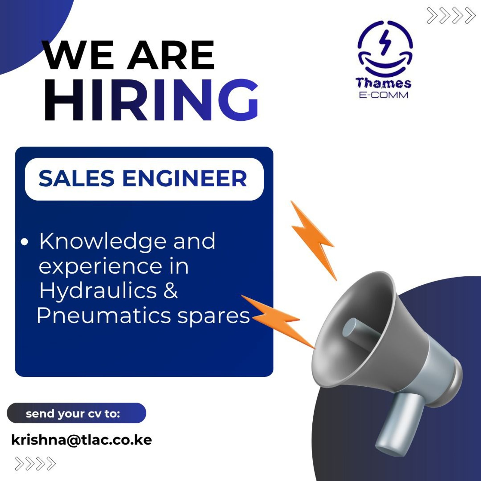 Sales Engineer- Knowledge and experience in Hydraulics & Pneumatics sparesSend your CV to:krishna@tlac.co.ke