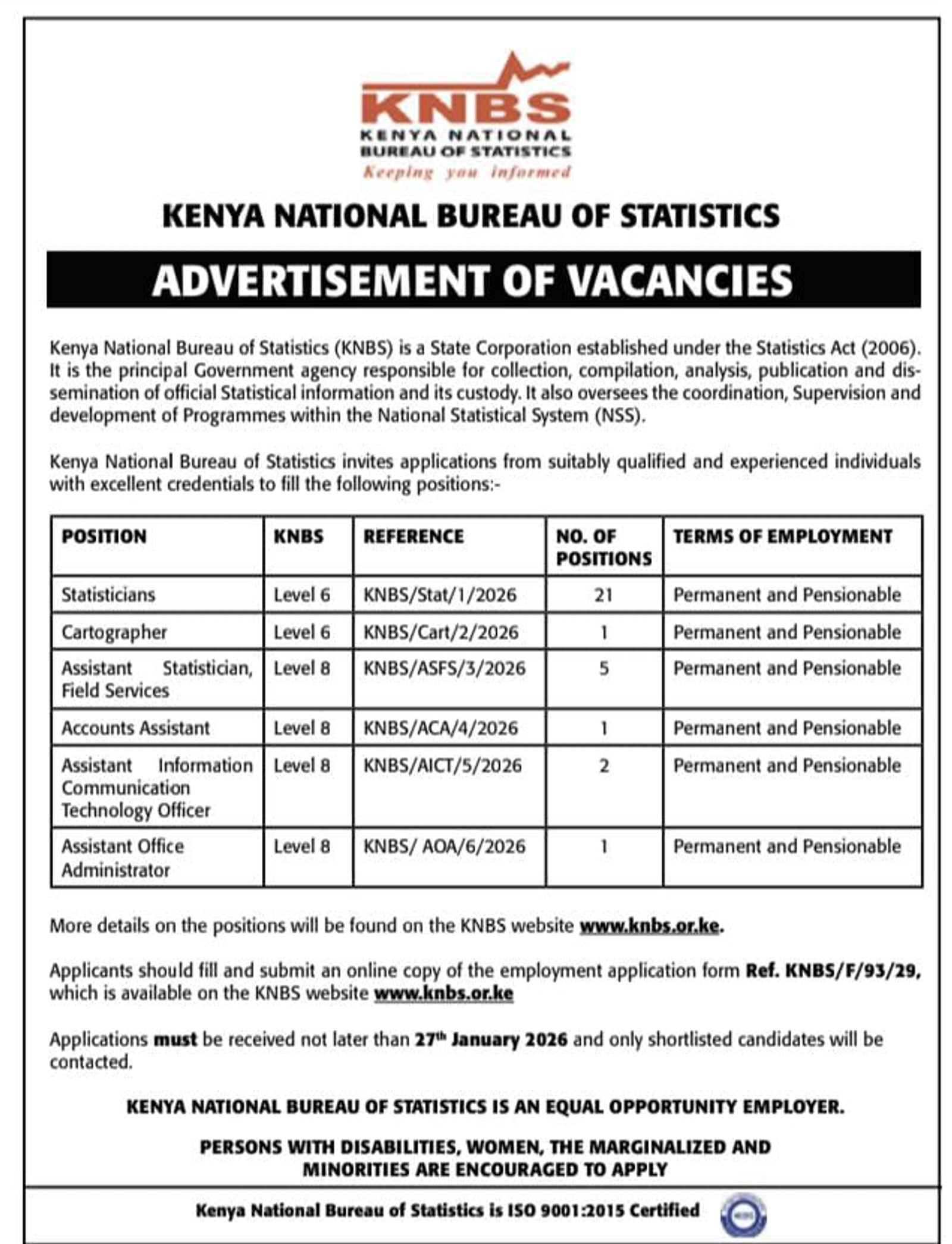 31 Positions at the Kenya National Bureau of Statistics