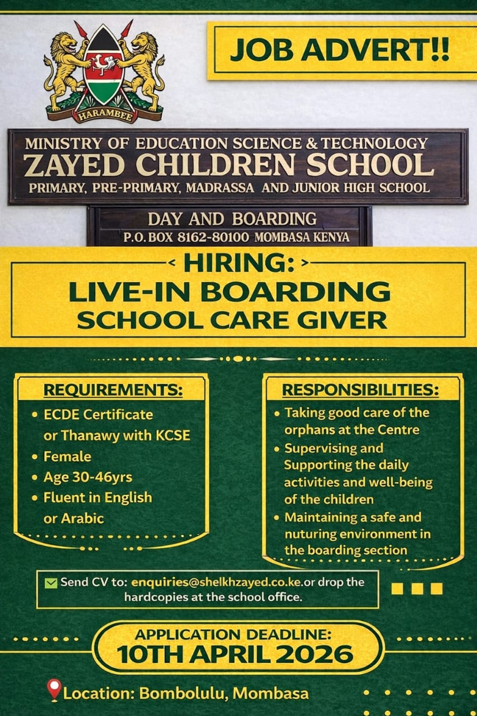 Send Cv to: enquiries@sheikhzayed.co.ke or drop the hardcopies at the school office